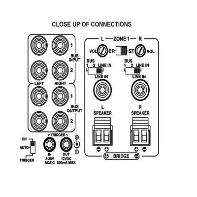 Two common or BUS inputs feed audio signals from standard line-level audio sources to any or all channels. Each of the twelve channels has its own dedicated input and independent level adjustment to provide further flexibility. By simply flipping a single switch, two channels can be bridged to increase the total power output for that zone. This is helpful when extra power is needed in certain areas. Manual, automatic on/off, or triggered 12V input turn-on modes facilitate easy integration into automated systems. For quick and easy troubleshooting of the system, each pair of channels or zones has a bi-colour LED to indicate its operational status.
